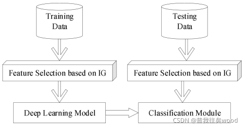 本文利用了IG信息增益将来自KDDCUP-99数据集的41个特征提取出28个作为神经网络的训练数据。然后使用CNN和LSTM构建神经网络对网络流量进行二分类。最后训练结果训练精度达到0.99,测试精度达到0.925。
