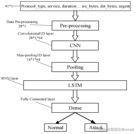 可以看到,经过IG特征提取后,原数据集的41个特征降为了28个特征,经过最大池化层采样成14个,输入到LSTM。然后再经过全连接层,最后输出分类结果,二分类。