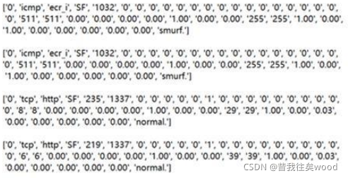 下图显示了DKK99的数据集的数据片段。每条数据由41个特征和一个标签组成。其中数据的第二,第三,第四和最后一维是字符串,其他都是数据数据。