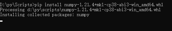 我这里输入的命令为【pip install numpy-1.21.4+mkl-cp38-cp38-win_amd64.whl】