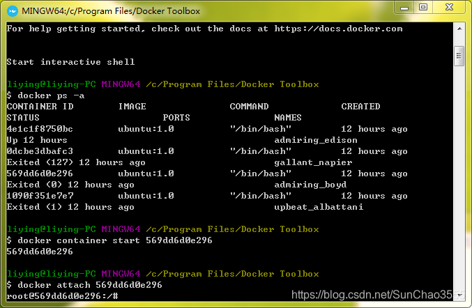 -->docker attach 569dd6d0e296,随后即进入指定版本的ubuntu创建的容器(linux系统中)