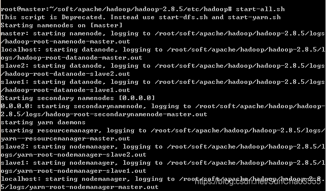在master节点上执行start-all.sh命令,启动Hadoop。