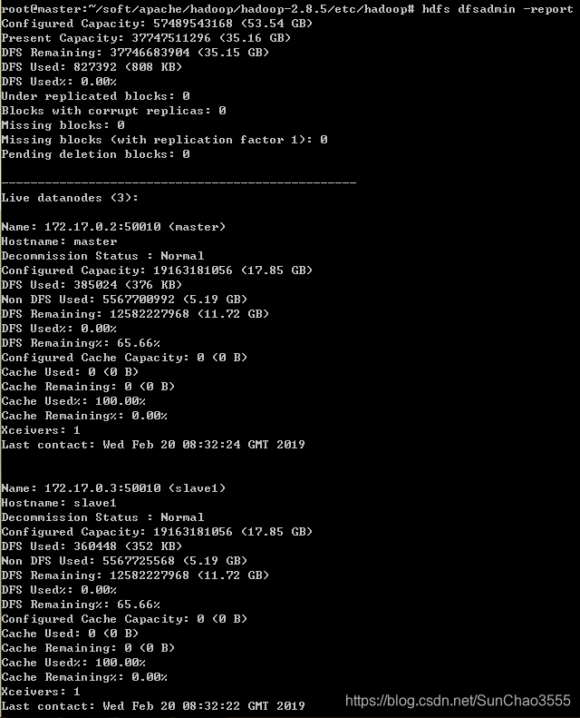 在master节点上通过命令hdfs dfsadmin -report查看DataNode是否正常启动