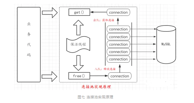连接池对外提供get()和free()两个API,get()用于从队首“出队”获取一条可用连接,free()用于将使用完的连接从对尾“入队”释放到队列中。