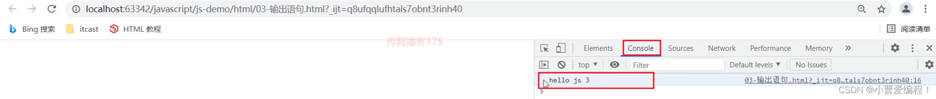 <!DOCTYPE html> <html lang="en"> <head> <meta charset="UTF-8"> <title>Title</title> </head> <body> <script> console.log("hello js 3");//写入浏览器的控制台 </script> </body> </html>上面代码通过浏览器打开,我们可以在不能页面上看到