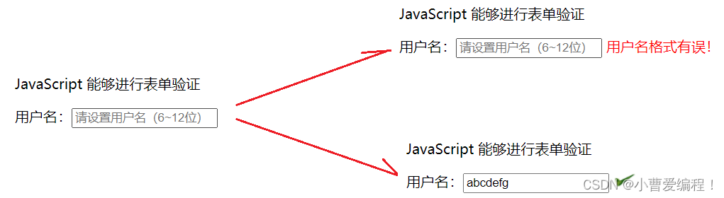 在上面左图的输入框输入用户名,如果输入的用户名是不满足规则的就展示右图(上) 的效果;如果输入的用户名是满足规则的就展示右图(下) 的效果。