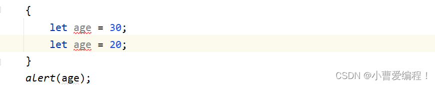 { let age = 20; } alert(age);运行上面代码,浏览器并没有弹框输出结果,说明这段代码是有问题的。通过