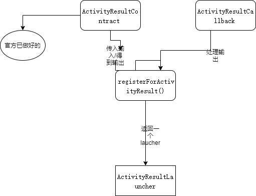 启动一个activity需要一个laucher,这个laucher由registerForActivityResult返回,这个方法需要两个参数,一个参数为一个抽象类——ActivityResultContract<I, O>的实现,另一个参数是一个函数式接口的实现(用一个lambda表达式来代替)。