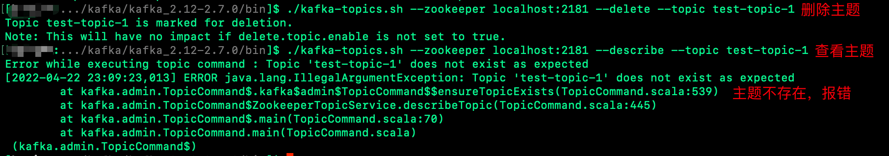 ./kafka-topics.sh --zookeeper localhost:2181 --delete --topic test-topic-1执行结果如下:
