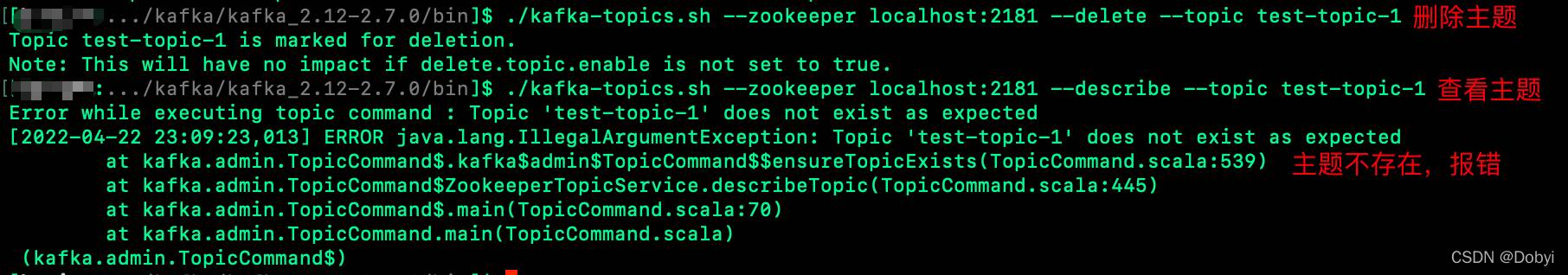 (1)手动删除各节点${log.dir}目录下该主题分区文件夹,同时登录ZooKeeper客户端删除待删除主题对应的节点,主题元数据保存在/brokers/topics和/config/topics目录下。