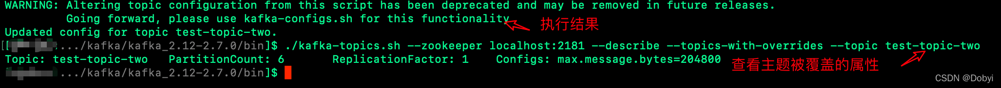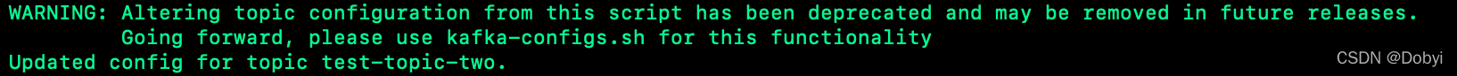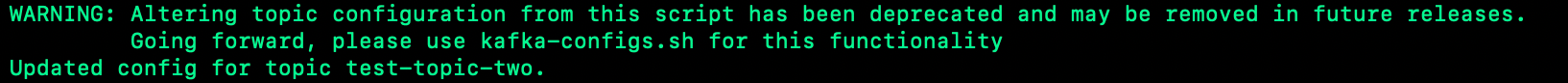 更新配置成功,同时输出信息提示通过该方式修改主题级别配置的相关命令已过期,在未来的版本该命令将被移除,推荐使用kafka-configs.sh脚本。