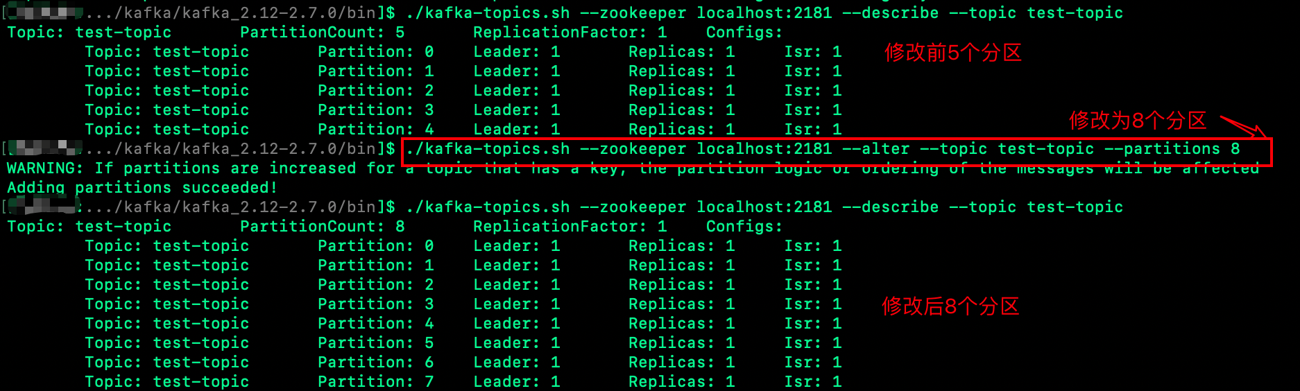 ./kafka-topics.sh --zookeeper localhost:2181 --alter --topic test-topic --partitions 8执行结果如下: