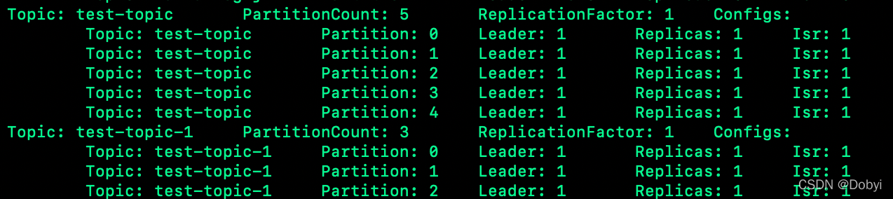 从输出结果可以看到:已按主题分组展示,每组主题信息中第一行分别展示了主题名、该主题分区总数、该主题副本总数、创建主题时通过config参数所设置的配置,从第二行开始按主题分区编号排序,展示每个分区的Leader副本节点、副本列表AR及ISR列表信息。
