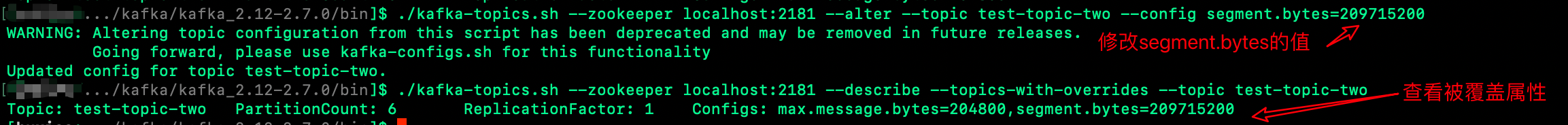 ./kafka-topics.sh --zookeeper localhost:2181 --alter --topic test-topic-two --delete-config segment.bytes注意命令:--delete-config