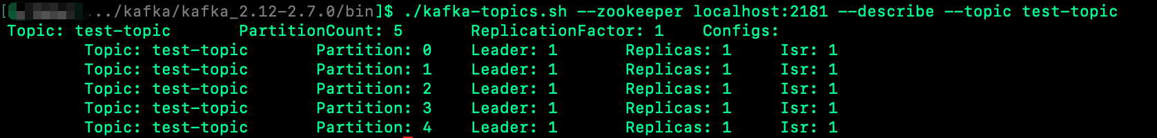 ./kafka-topics.sh --zookeeper localhost:2181 --create --topic test-topic --replication-factor 1 --partitions 5执行结果如下:
