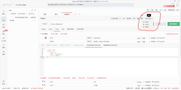 这里自动获取接口状态,就是是否获取接口的状态,接口状态一般三种:开发中、已完成和需修改。