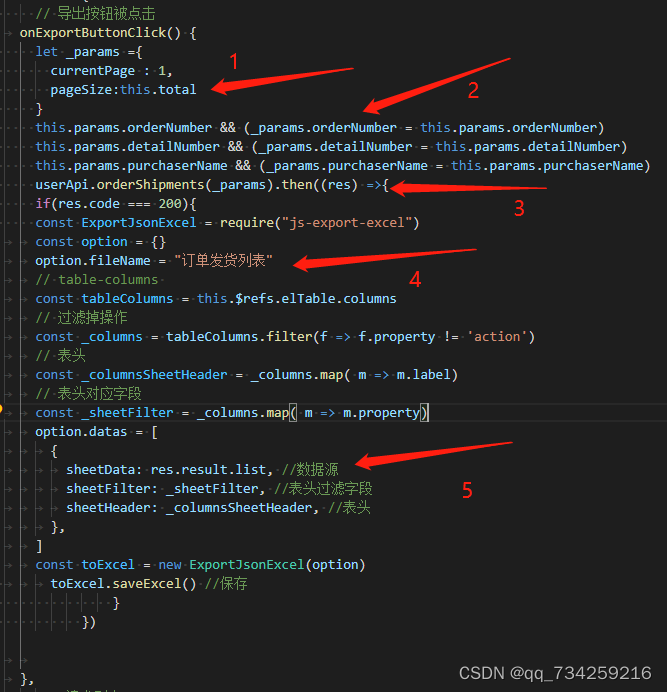 共标记了5处,第1处是请求的参数pageSize是条数,我们需要把页面的总条数给他赋值,我这里拿的this.total是我项目里接口返回的总条数,我自己存了一下,相信大家肯定也会用到这个数据,分页的时候是需要的,第2处是我对我的接口参数做了处理,为了就是不操作原参数,如果这里你直接用你请求数据的那个对象的话,当你点完导出后页面会出现问题,所以不要去操作原参数,自己定义一个对象只用来导出的时候用。第3处就是请求,根据个人项目写,第4处就是导出的文件名字,第5处很重要这是你接口返回的数据,也是你要导出的数据,依据个人接口返回赋值。附上代码: