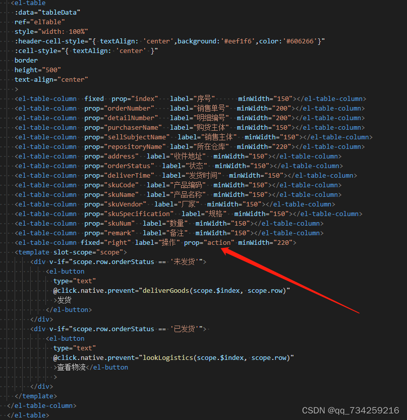 prop绑定的是你后端返回的字段名字,上面箭头指向的是我自己加了一个字段名字,因为数据需要编辑等一系列的操作这个prop="action"等会在导出的时候去掉,如果不加可能导出的表头就会多一个操作,并且内容是空的,没什么用所以自己做了小处理,接下来就是最重要的一步了,将这些东西写在你的点击事件里面