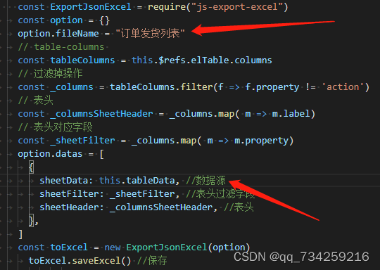 上面的箭头指的是你要导出的文件名字,下面的这个箭头指向的数据源,这个是你在绑定el-table的时候用的:data="tableData",里面存的是你接口返回的数据。其他基本不用改变,附上代码