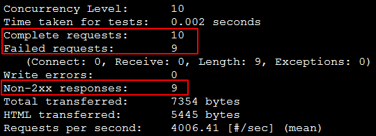 通过 ab 测试后的结果,10 个并发连接,只有 1 个成功,剩余 9 个都返回 非200 状态,查看 Nginx 日志: