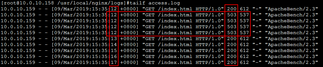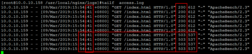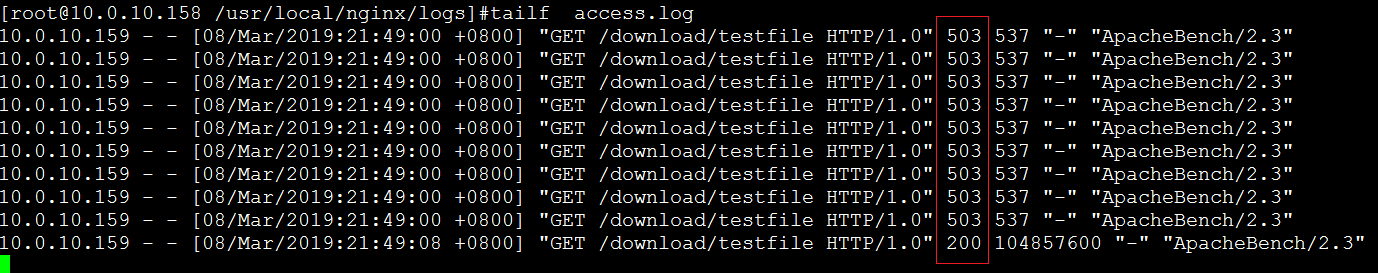 经过这次的测试,完成了 10 个并发连接,其中 9 个返回的是 非200 的状态。继续查看 Nginx 日志: