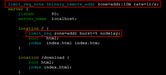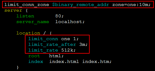 因此,如果要进行限速,可以和 limit_conn_zone 模块配合进行使用。配置如下: