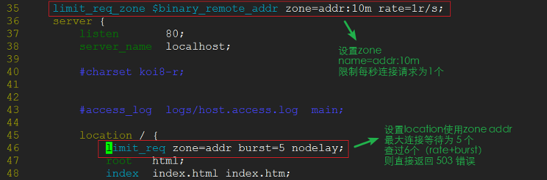 (1)不加 burst 和 不加 nodelay 的情况:按照 rate 设定的规则,严格执行。例如:rate=1r/s ,则1秒只处理1个请求,其他的全部返回连接503