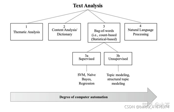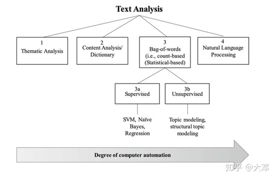上述文本分析技术,按照人与机器参与程度,绘制在下图。一般来说,越向右,文本分析技术的自动化程度越高,需要注意的是自动化越高,并不代表人的工作量就越少。