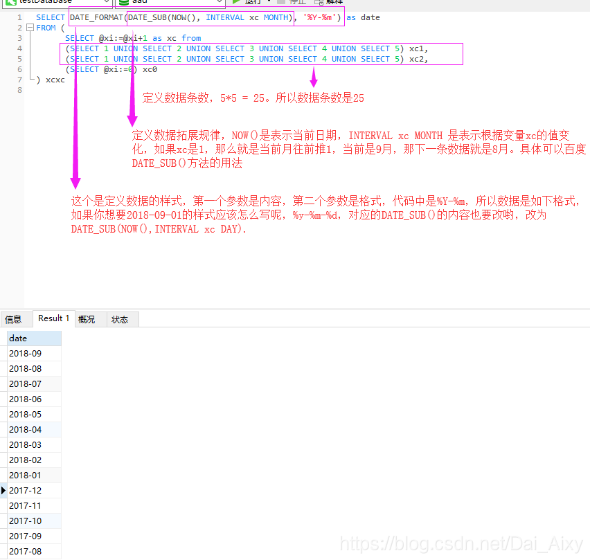 在看这篇文章以前呢,得明白几个知识点,存储过程(如何创建,如何调用,好处是什么)、变量(如何创建,赋值,使用)、DATE_SUB、DATE_FORMAT、