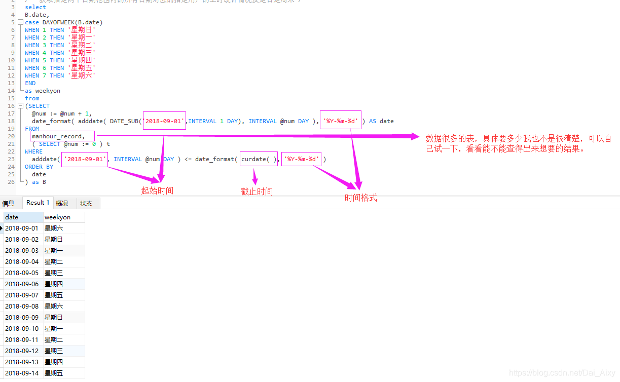 总结:在如上的例子当中,涉及到的知识点是变量,DATE_SUB(),DATE_FORMAT().使用以上方法的好处就是不用创建存储过程,也不涉及到任何表。缺点就是数据的条数控制并不灵活,不能和用户之间形成互动,即不能自定义日期区间,只能控制数据条数。
