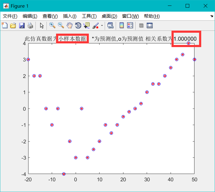 以下为测试样本数据:%测试样本P_test P_test=[-20 -17.5 -15 -12.5 -10 -7.5 -5 -2.5 0 2.5 5 7.5 10 12.5 15 17.5 20 22.5 25 27.5 30 32.5 35 37.5 40 42.5 45 47.5 50 ; -4 -2 -0.5 1 2 2.5 4 3 4 3 3 2.5 2 1 1.5 1 0.5 0.2 0 -0.3 -1 -1.5 -1.5 -2 -2.5 -3 -3.3 -4 -4.1]; %测试目标t1 t1=[4 2 0.5 -1 -2 -2.5 -4 -3 -4 -3 -3 -2.5 -2 -1 -1.5 -1 -0.5 -0.2 0 0.3 1 1.5 1.5 2 2.5 3 3.3 4 4.1];