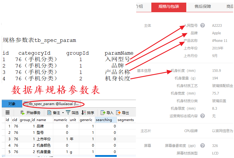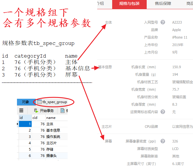- 相同分类下的商品,比如小米手机和苹果手机,其规格参数是一样的。