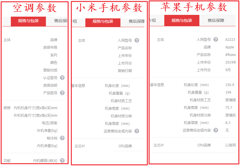上面三张图,分别对应着空调和手机的规格参数,当然参数有很多,我只是截图了一部分。