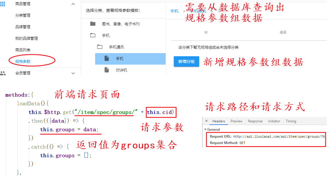 在刘小爱商城后台管理系统中,我们可以找到和规格参数相关的页面。