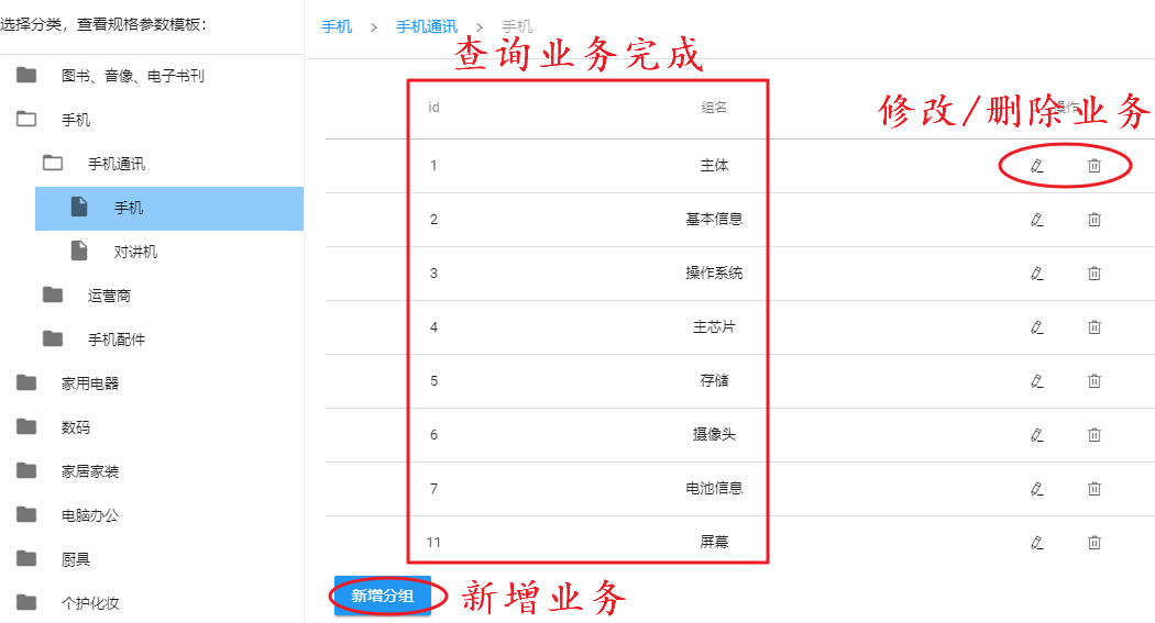 一个商品分类下有多个规格组,比如手机的规格组有:主体、基本信息、屏幕…等。