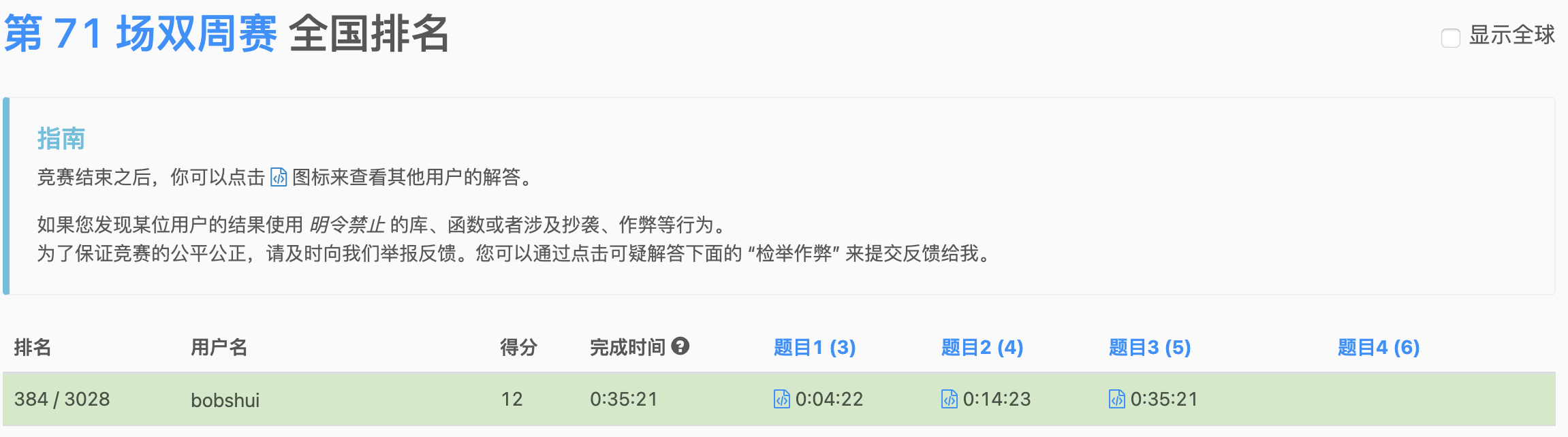 结局: 这是本菜鸡第二次参赛,当然依然是重在参与,不过前三题还是算比较顺风顺水的,第4题下来仔细参详了一下,思路应该说没问题,但对于常用的数据结构不够敏感,如果能很快的想到堆或者优先队列,可能能够拿下此题。总的来说比起第一次在第三题就有若干案例卡住,还是有所进步。Anyway,继续努力。