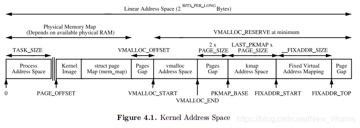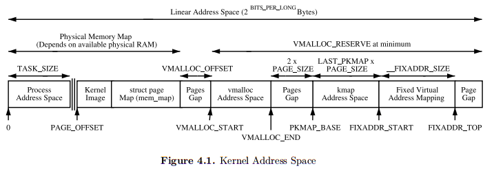 进程使用的地址空间由mm_struct管理。每个进程地址空间中都包含许多使用中的页面对齐的内存区域。(他们不会重叠,而且表示了一个地址的集合,这个集合包含那些出于保护或其他目的而相互关联的页面。)这些区域由struct vm_area_struct管理。具体而言,一个内存区域可能表示malloc()所使用的进程堆,或是一个内存映射文件(例如共享库),又或者是一块有mmap()分配的匿名内存区域。这些区域中的页面可能还未被分配,或已分配,或常驻内存中,或已被交换出去。