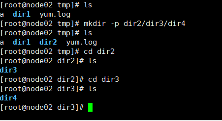 7. # mkdir -p dir2/dir3/dir4 强制创建文件夹,如果指定目录没有,则指定目录