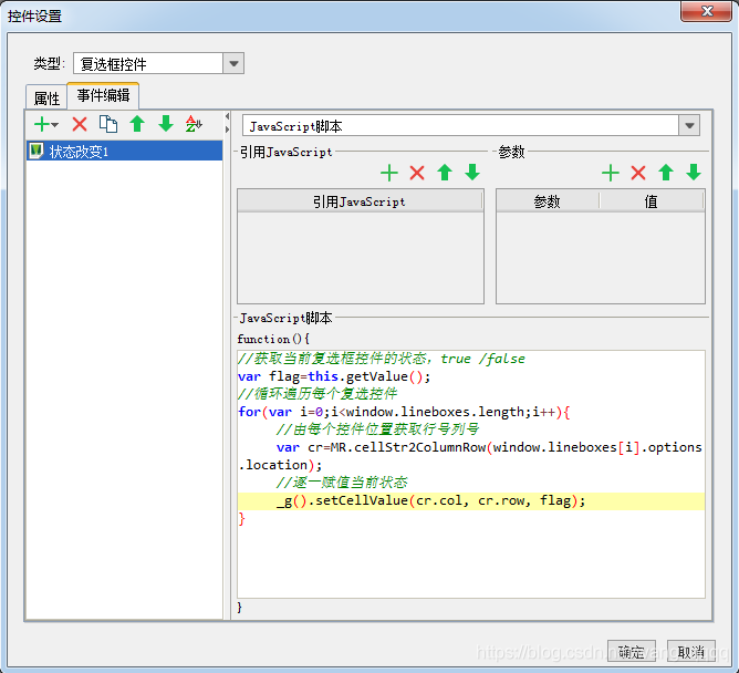 如上,通过设计报表的单元格或控件,触发js事件,就可以实现复选框的全选/全取消。