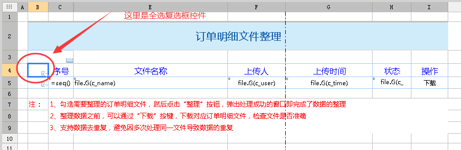在复选框控件的应用中,不乏复选框较多的情况下,需要进行全选/全取消的操作,方便用户进行数据的审批、入库等等,此时我们可以利用单元格或控件,触发js事件,实现复选框的全选/全取消功能,当然,一般我们还是习惯用用复选框来实现全选/全取消的功能。
