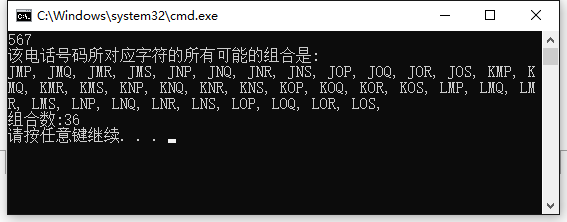 算法分析:递归出口是:当输入的是一个数字时,返回这个数字所有可能性的组合,递归体是当输入一串数字,每个数字代表不同的字符串,返回最后一个数字跟前面已产生的字符串进行组合。如输入567,则有3*3*4=36种组合,每一个组合必定包含三个字符串,如{“JMP”,“JNP”….}等。