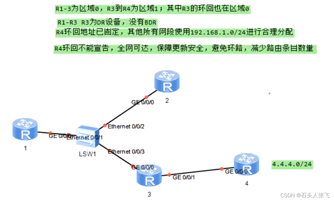 1.R1-3为区域0,R3到R4为区域1;其中R3的环回也在区域0