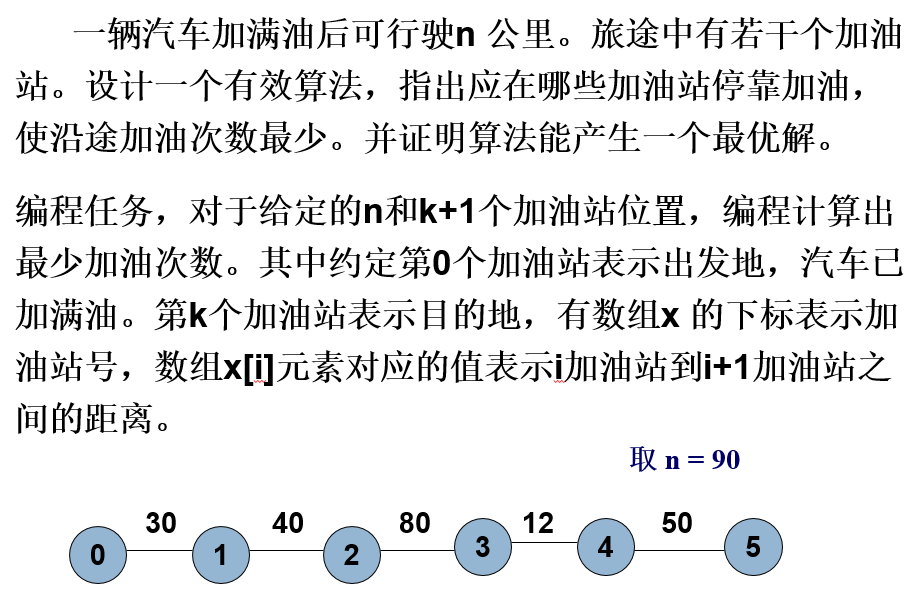 - 贪心策略:每次开到尽量远的加油站加油,也就是说不得不加油的时候。如:到了一个加油站正好没油,或者到了一个加油站不加油,剩余油就不够开到下一个加油站。