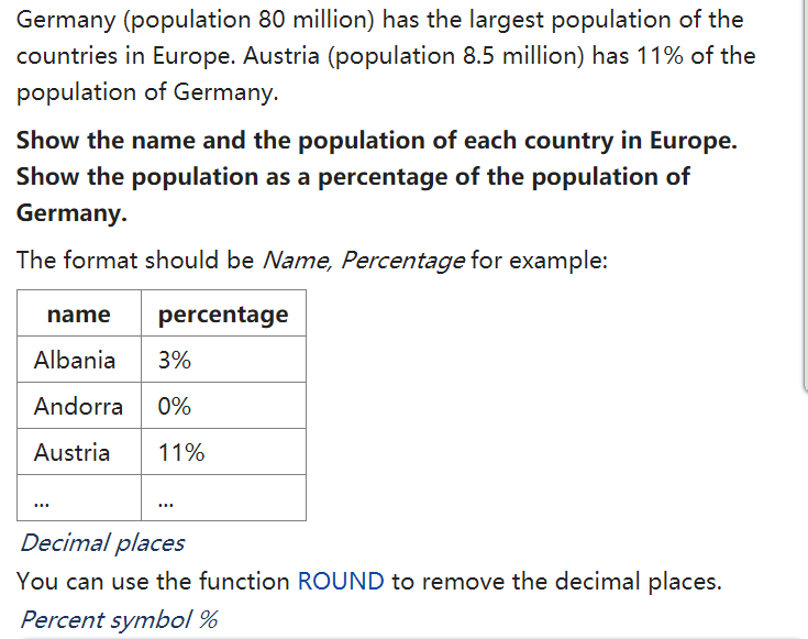 SELECT name, CONCAT(ROUND(population/(SELECT population FROM world WHERE name = 'Germany')*100), '%')