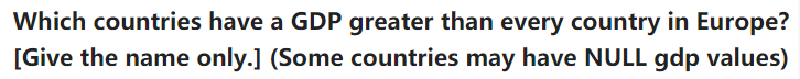 题目如下,选出GDP比欧洲每个国家都高的国家