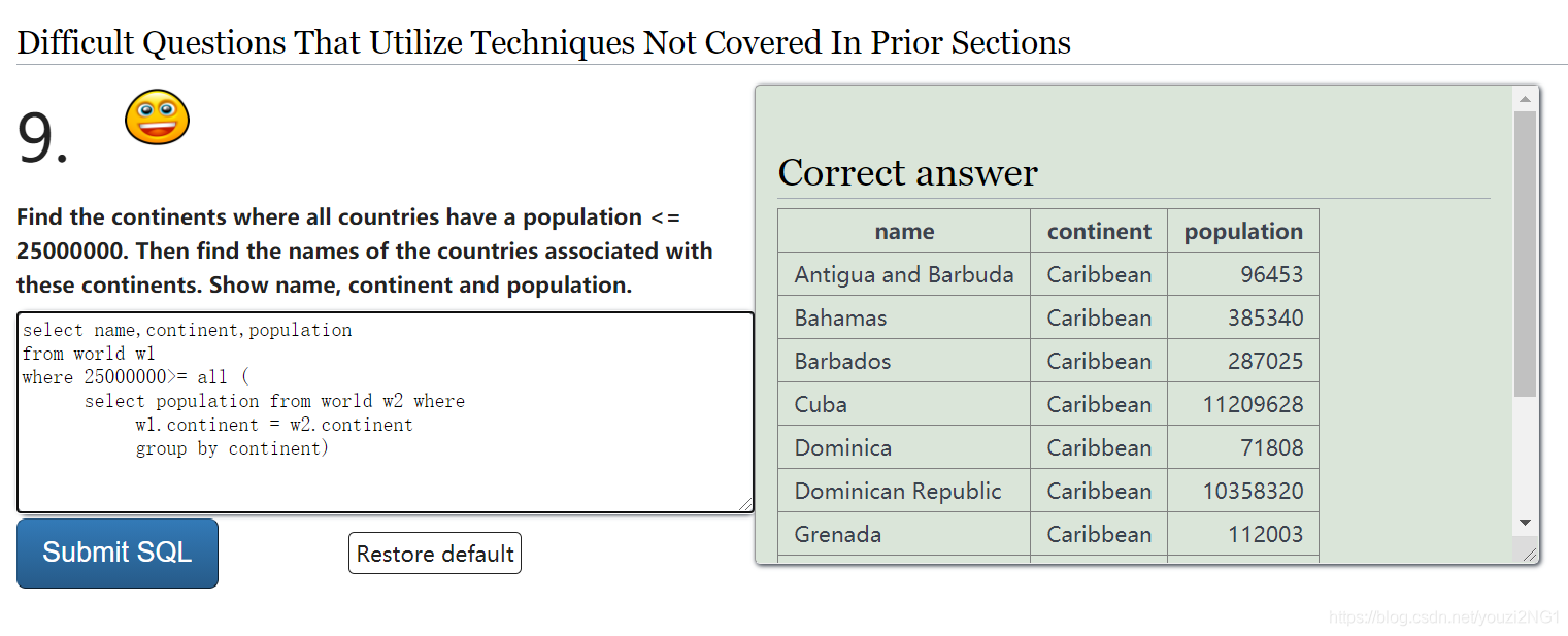 from world w1 得到一个新的表W1,对应新表中的每一行数据分别按照where条件进行选择是否查出,而where条件中包含了括号中的查询,该查询首先生成一个新的表 w 2,按照和当前判断的W1的这一行中的continent值是否相同进行选择,即: w1.continent = w2.continent,如果相同的话就把他的population拿出来放在一个列表中,这样对w2表进行遍历后得到了当前w1表判断所需的一个list ,然后判断2500000是不是大于这个list中的所有的数。。。。。然后重复执行w2 中的下一行数据可以继续查询啦。
