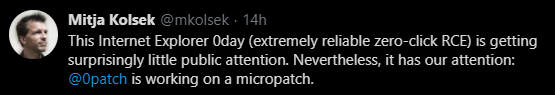 另据0Patch 平台创始人称,黑客还利用了 IE 11中的一个 0day 社工漏洞研究员,目前该平台已证实漏洞存在并表示正在推出补丁。微软表示正在调查此事。