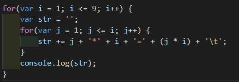 3.控制换行:console.log()默认是打印一行换一行,所以需要把一行的乘法数字都通过字符串拼接在一起,等这一行结束后,在for循环后面打印即可
