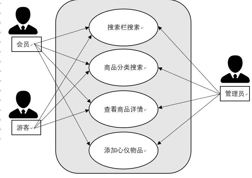 1)游客通过登陆注册成为会员才能添加心仪物品进入愿望清单。游客可以搜索商品,查看商品分类,根据商品分类来查看商品。