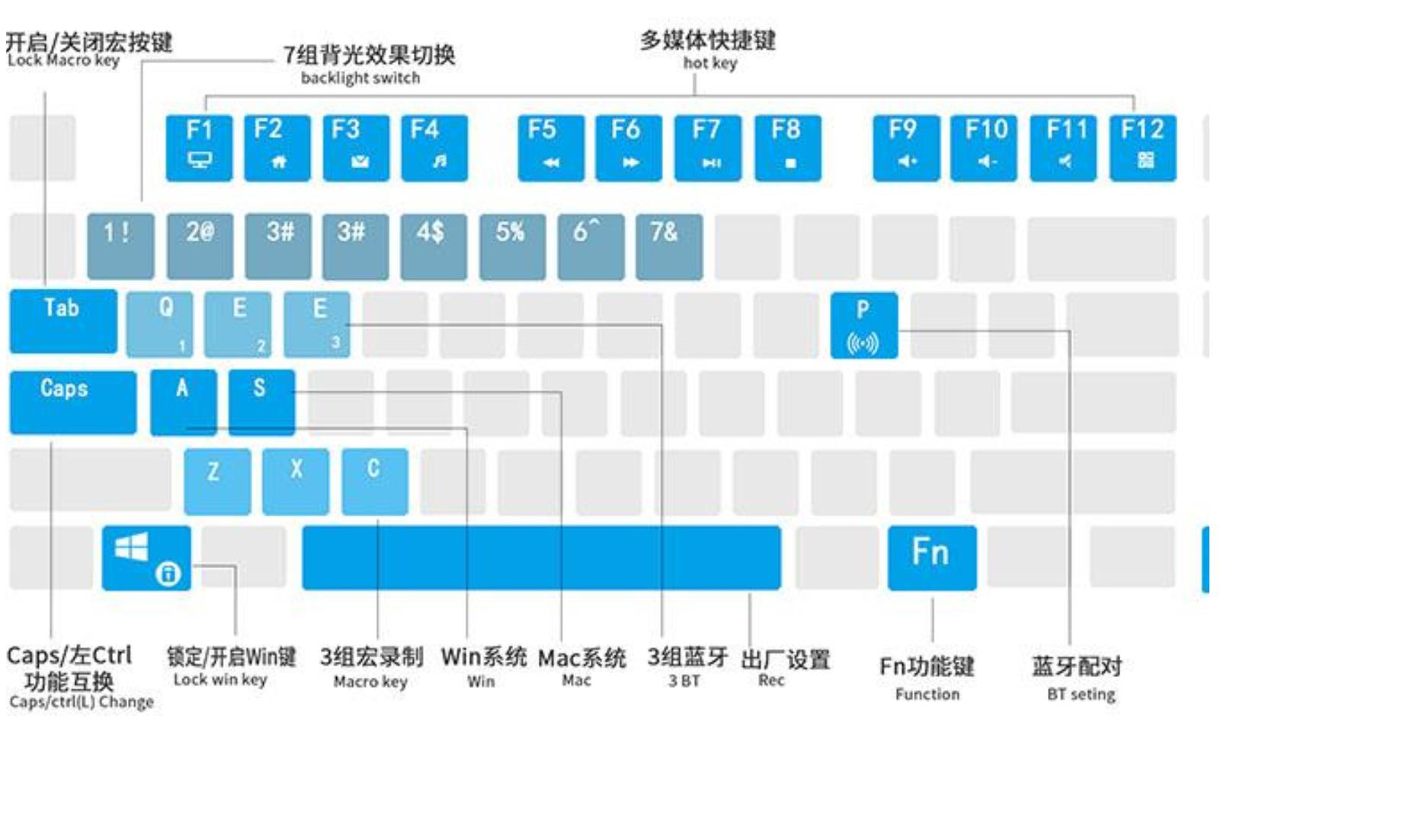 Fn+Win 关闭/开启 Win 键 Fn+A 切换为 win 系统 Fn+S 切换为 Mac 系统